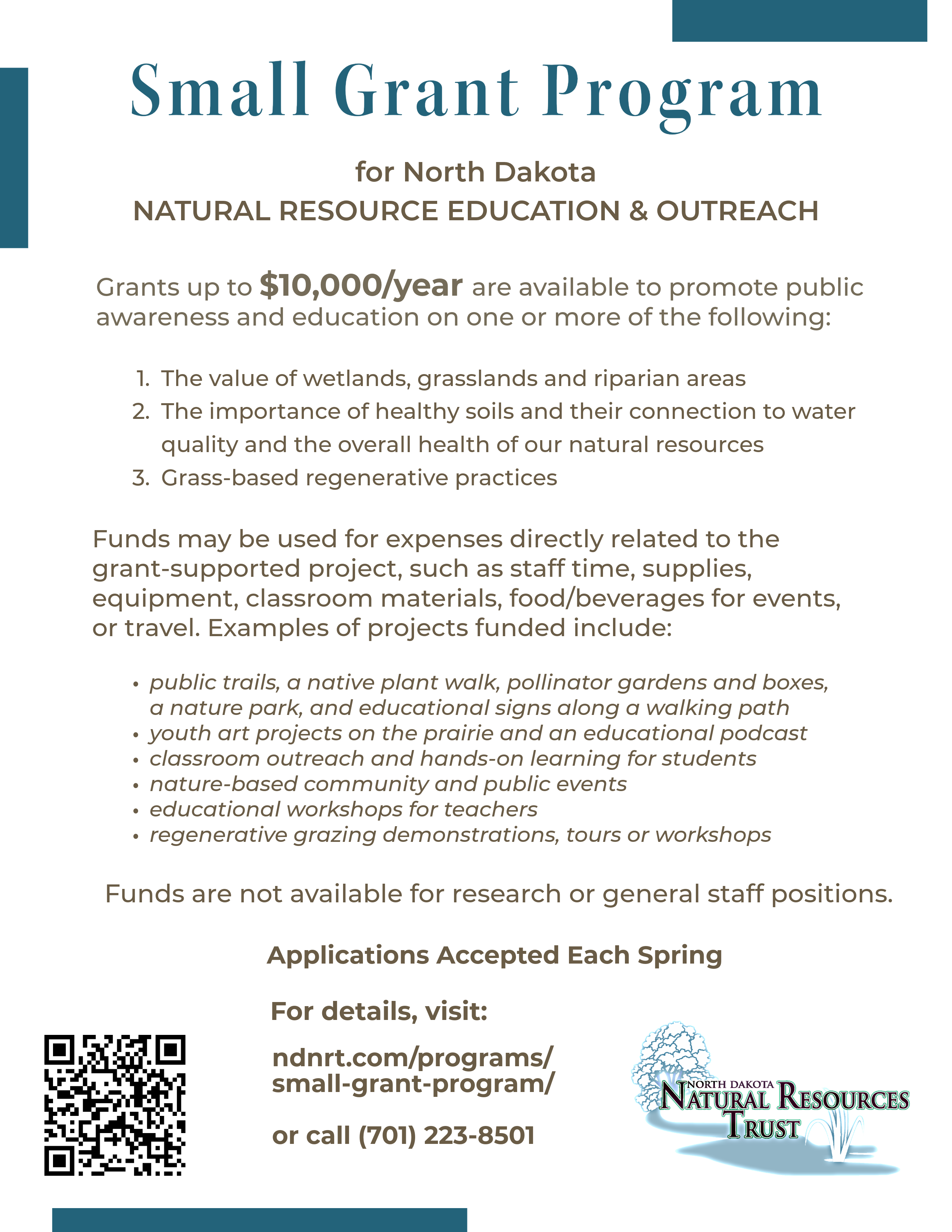 If you have any questions or would like to request guidance, feel free to contact our office at (701) 223-8501 or email info@naturalresourcestrust.com. Please let us know if you have trouble accessing any program documents. We look forward to seeing your project ideas!